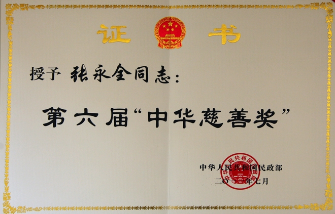 公司董事長張永全再次榮獲第六屆中華慈善獎愛心捐贈個人,這是董事長第三次獲得該獎項。該獎項獲獎人員全國共20人。7月15日,公司董事張玉鳳代表董事長赴京參會,并得到溫家寶總理等國家領導人的親切接見。