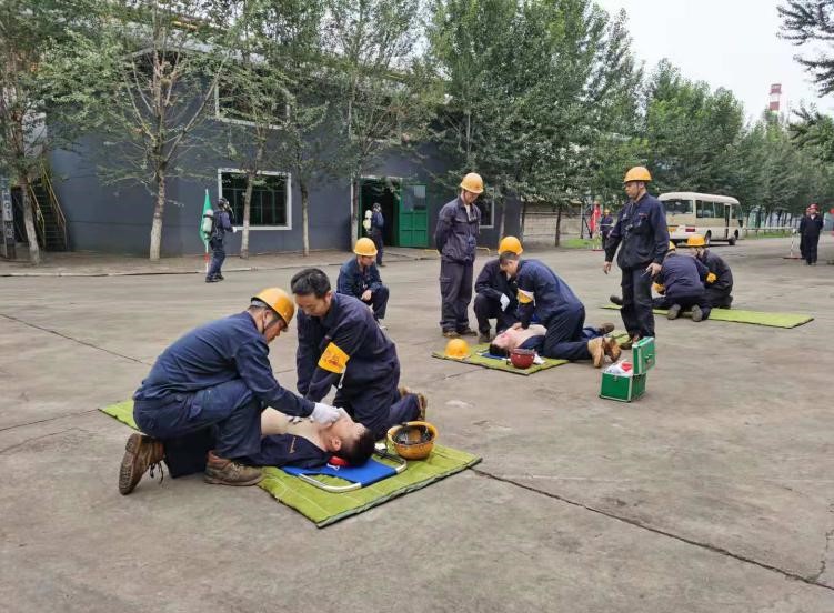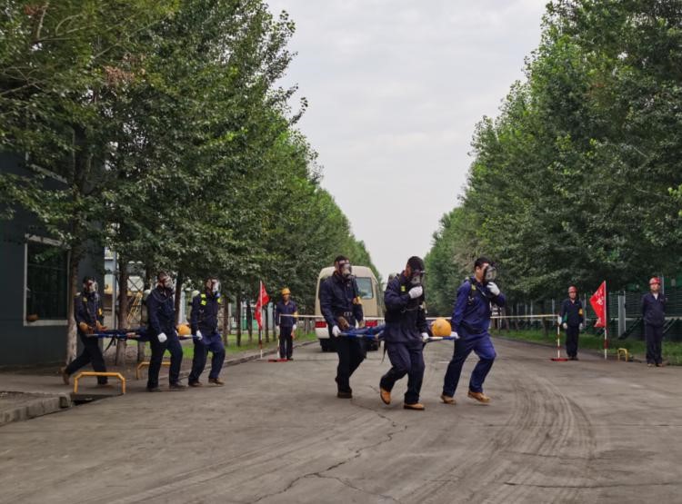 “報(bào)告馬廠長:我是當(dāng)班維護(hù)班長曹雷,9點(diǎn)35分左右班內(nèi)三名員工在煤氣閥組平臺(tái)巡檢過程中發(fā)生煤氣中毒事故,請求立即支援”……;“請搶險(xiǎn)救援組、安全警戒組、醫(yī)療救護(hù)組…立即趕赴事故現(xiàn)場集結(jié)”;“報(bào)告總指揮:搶險(xiǎn)救援組10人到達(dá)現(xiàn)場,6套呼吸器及3副擔(dān)架救援裝備完好,可正常使用”……;“各救援小組按預(yù)案規(guī)定程序及商定的實(shí)施方案,立即展開救援行動(dòng)”……;“報(bào)告總指揮:三名傷者已成功救出,兩人中毒較重,一人較輕,……”;“報(bào)告總指揮:煤氣泄漏部位搶修完畢,已無泄漏現(xiàn)象,設(shè)備可正常運(yùn)行”……。隨著一條條救援指令的下達(dá),現(xiàn)場警戒、現(xiàn)場救援、傷員急救、設(shè)備搶修、現(xiàn)場清理及組織生產(chǎn)恢復(fù)等過程緊張、有序地完成,實(shí)戰(zhàn)演練圓滿結(jié)束。