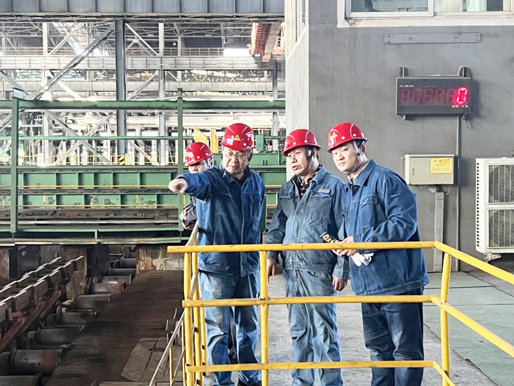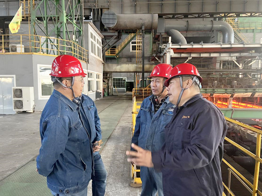 督導組組長楊殿新在煉鋼廠連鑄生產(chǎn)現(xiàn)場與公司生產(chǎn)經(jīng)理兼安全總監(jiān)陳旭東及煉鋼廠廠長閆海龍進行交流