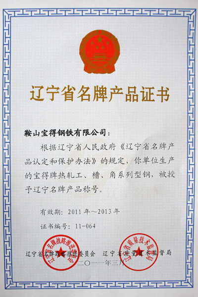 2011年3月,公司生產“寶得”牌熱軋工、槽、角系列型鋼,被遼寧省名牌戰(zhàn)略推進委員會、遼寧省質量技術監(jiān)督局授予“遼寧省名牌產品”稱號。